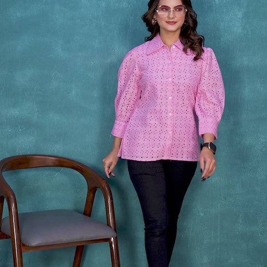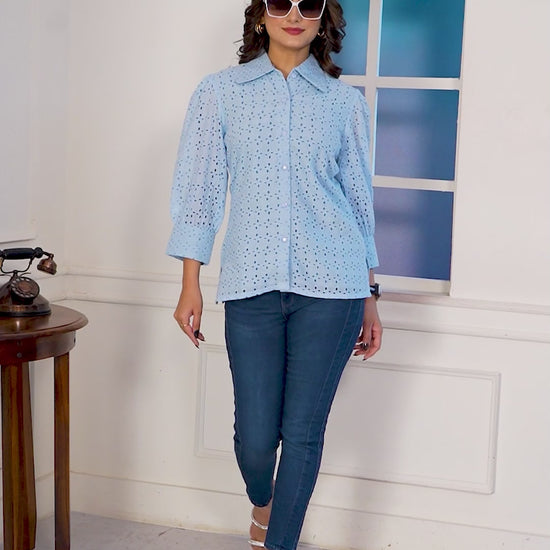 Style: Shirt collar design with front placket, puffed 3/4th sleeves, and curved hem for a tailored yet easygoing look