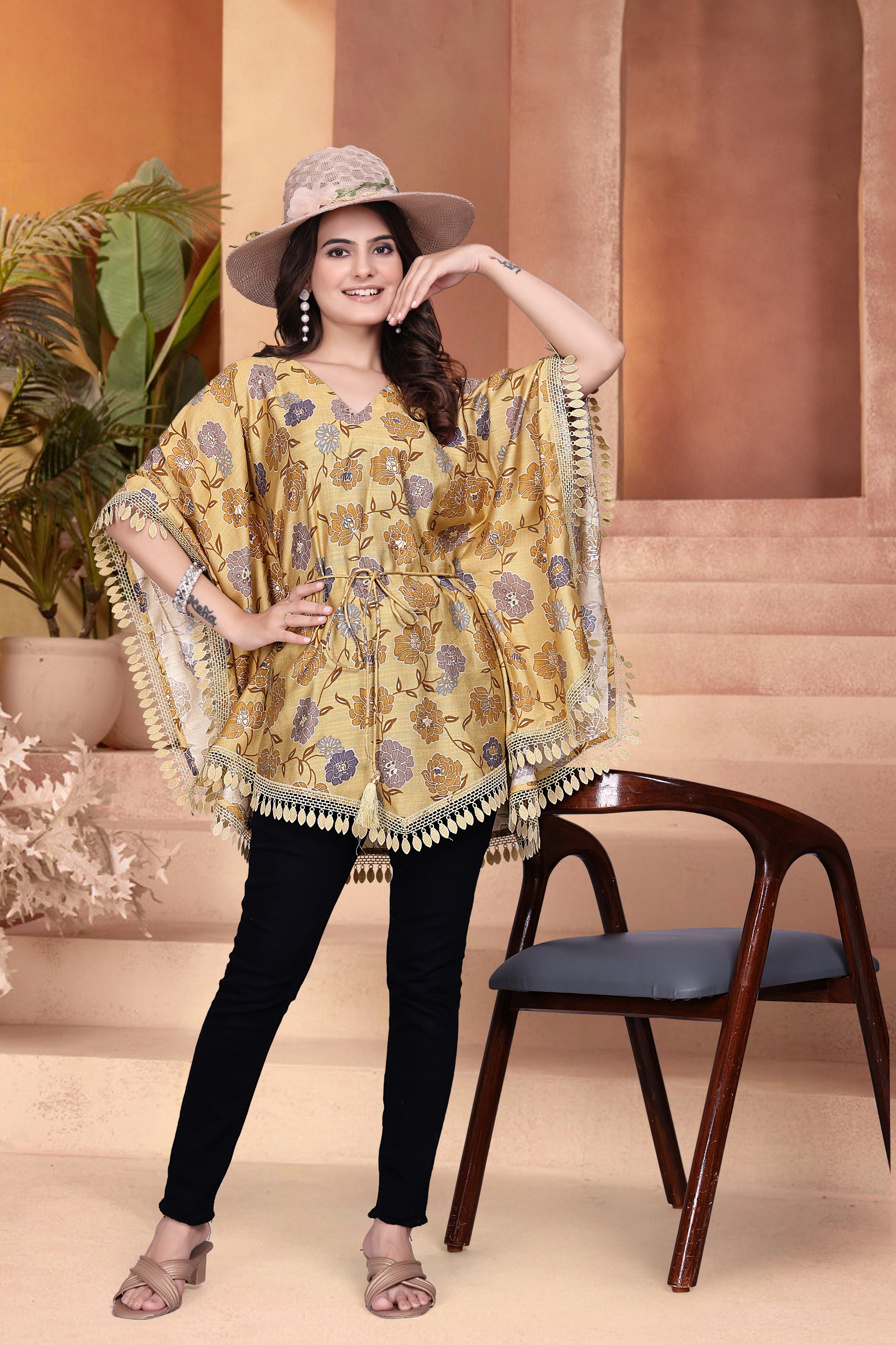 Flowy kaftan silhouette with wide sleeves, finished with intricate lace-trim tassel edges