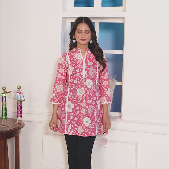 Available in blush pink and sky blue tones, each featuring an all-over white floral print that exudes freshness and charm. The tunic is tailored with princess panel seams for a flattering, contoured silhouette. A slit mandarin neckline and 3/4th sleeves are accented with delicate Schiffli lace, enhancing its feminine appeal. The fabric offers a breathable yet structured feel, making it ideal for both workwear and casual outings.