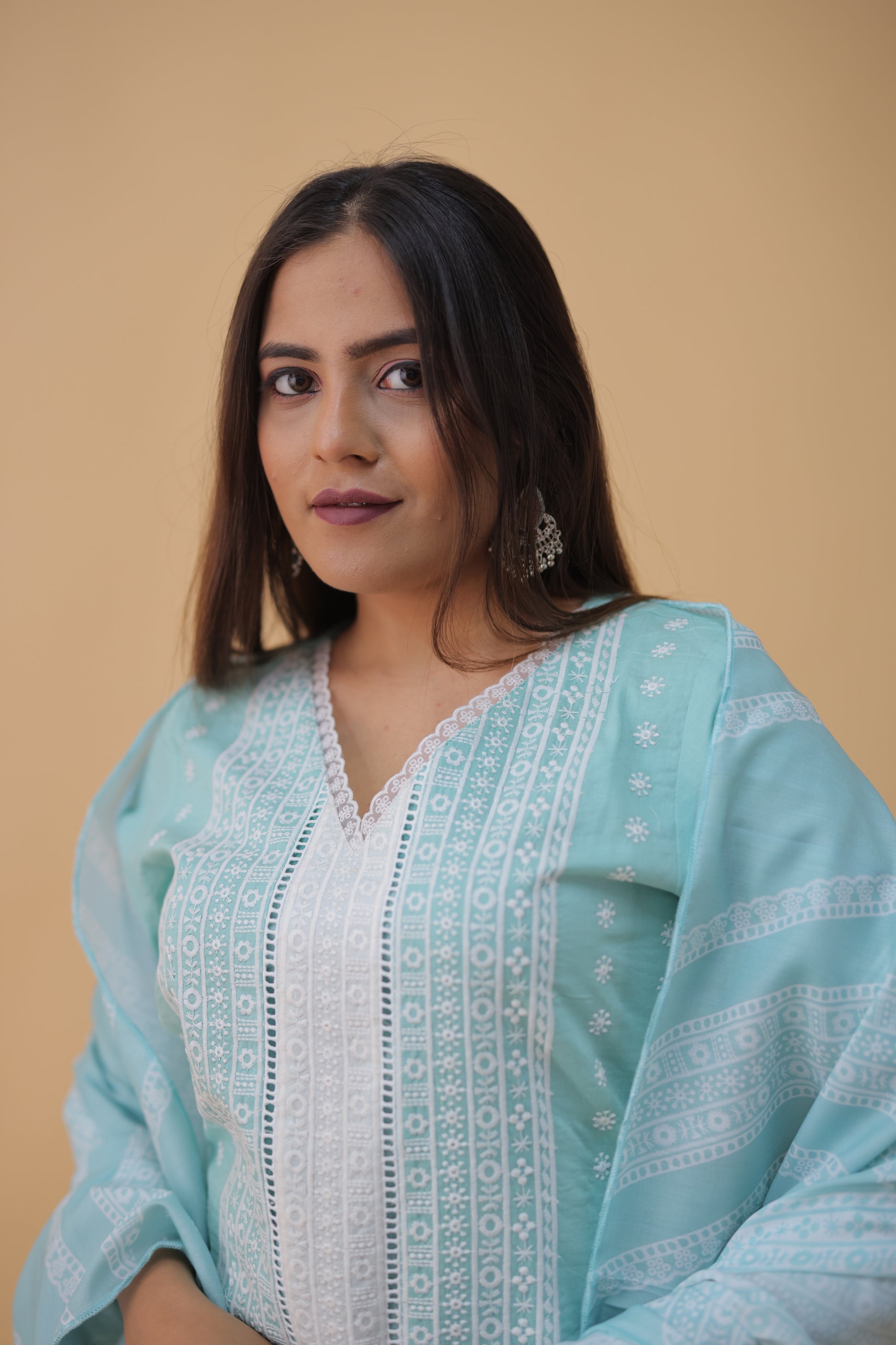 Cool sky blue hue with delicate white Schiffli motifs for a breezy aesthetic