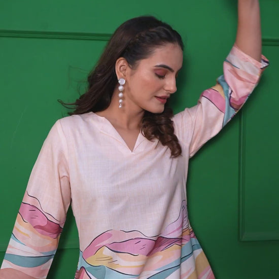 Pastel abstract print in soft pink, blue, and warm neutral shades.