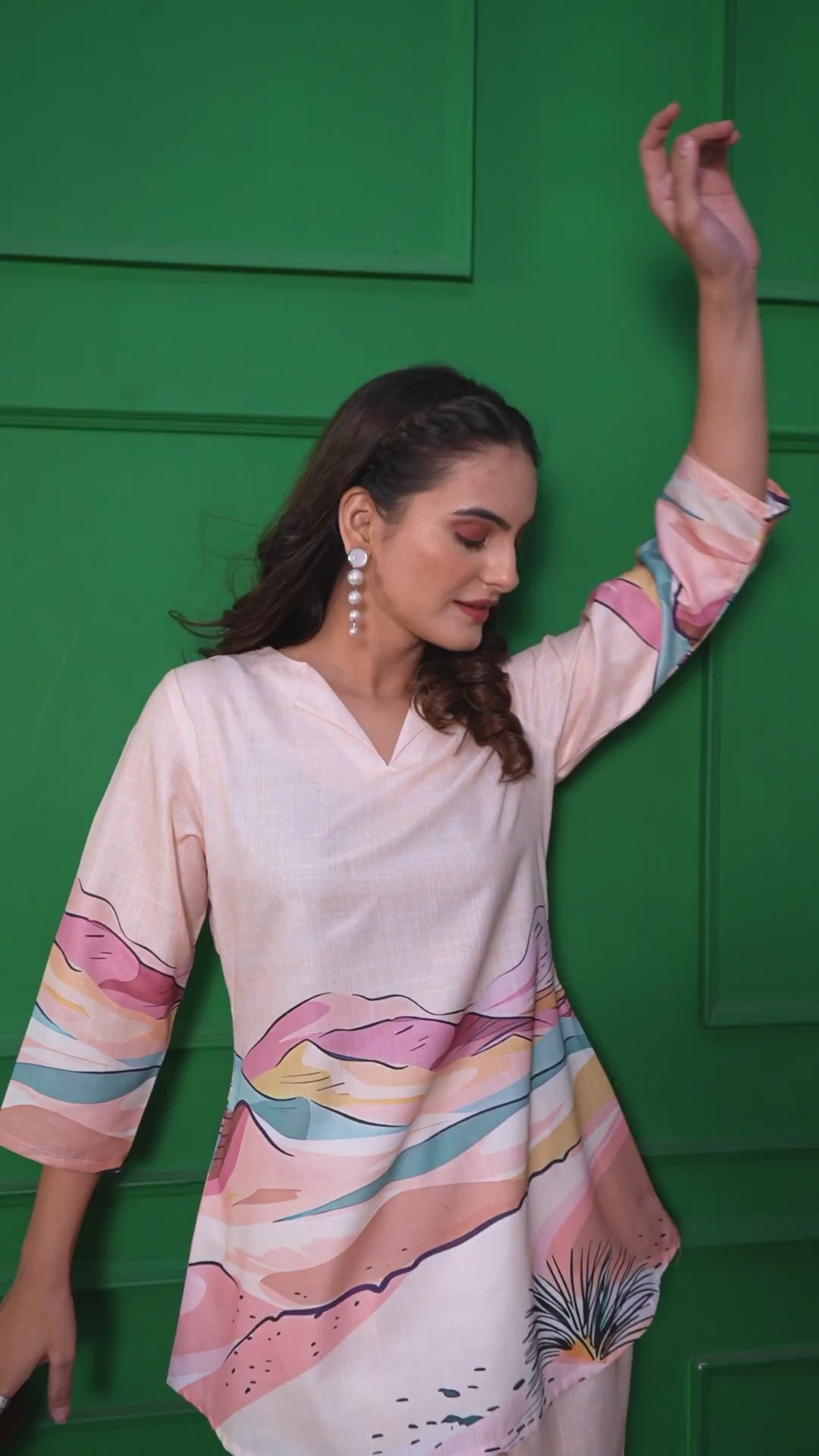 Stylish kurta-style top with three-quarter sleeves and side slits for ease of movement.