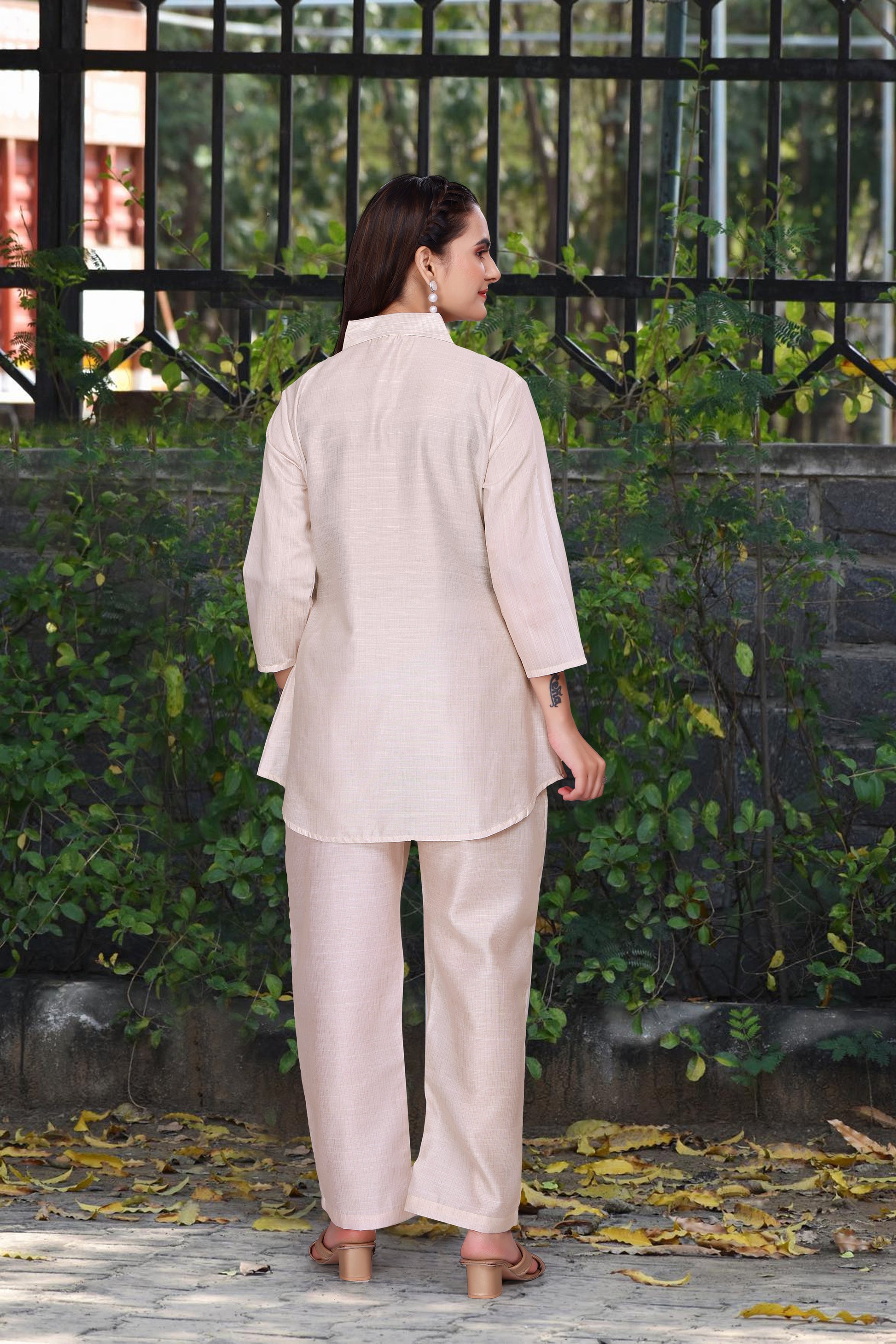 Modern shirt-style top with button-down front and slim cuffed full sleeves.