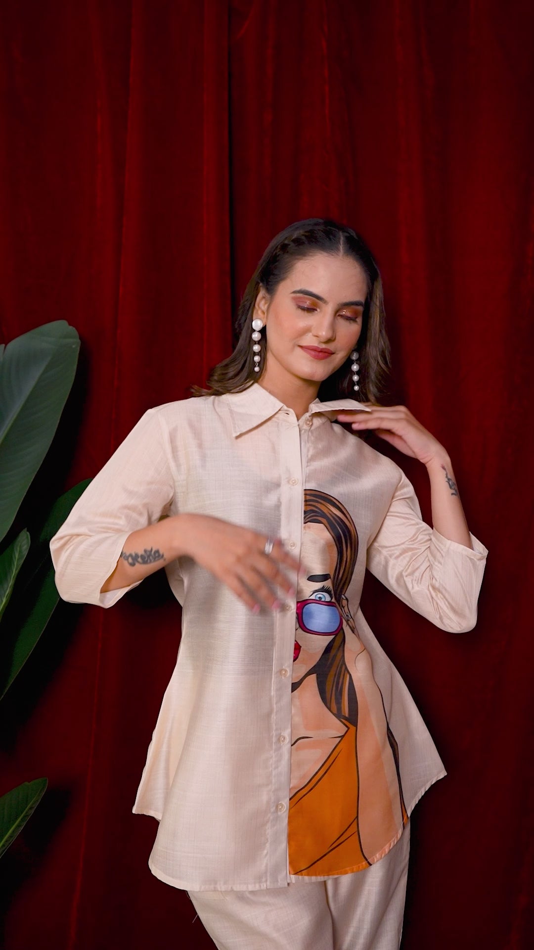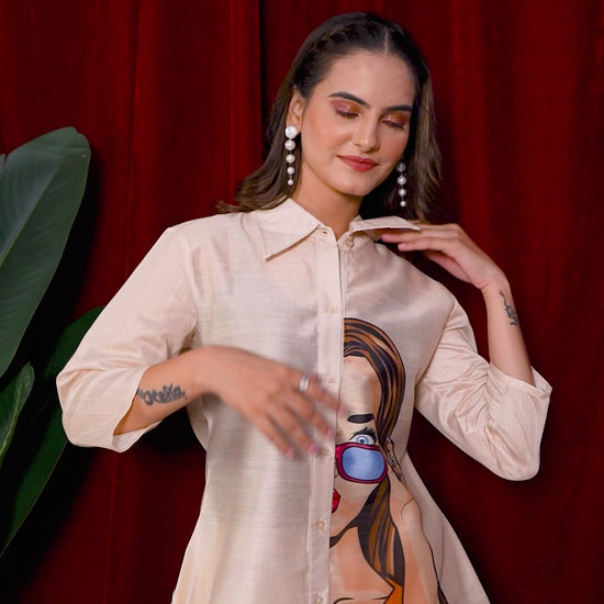 Striking digital illustration print of a woman in sunglasses, adding an artsy and fashion-forward edge.