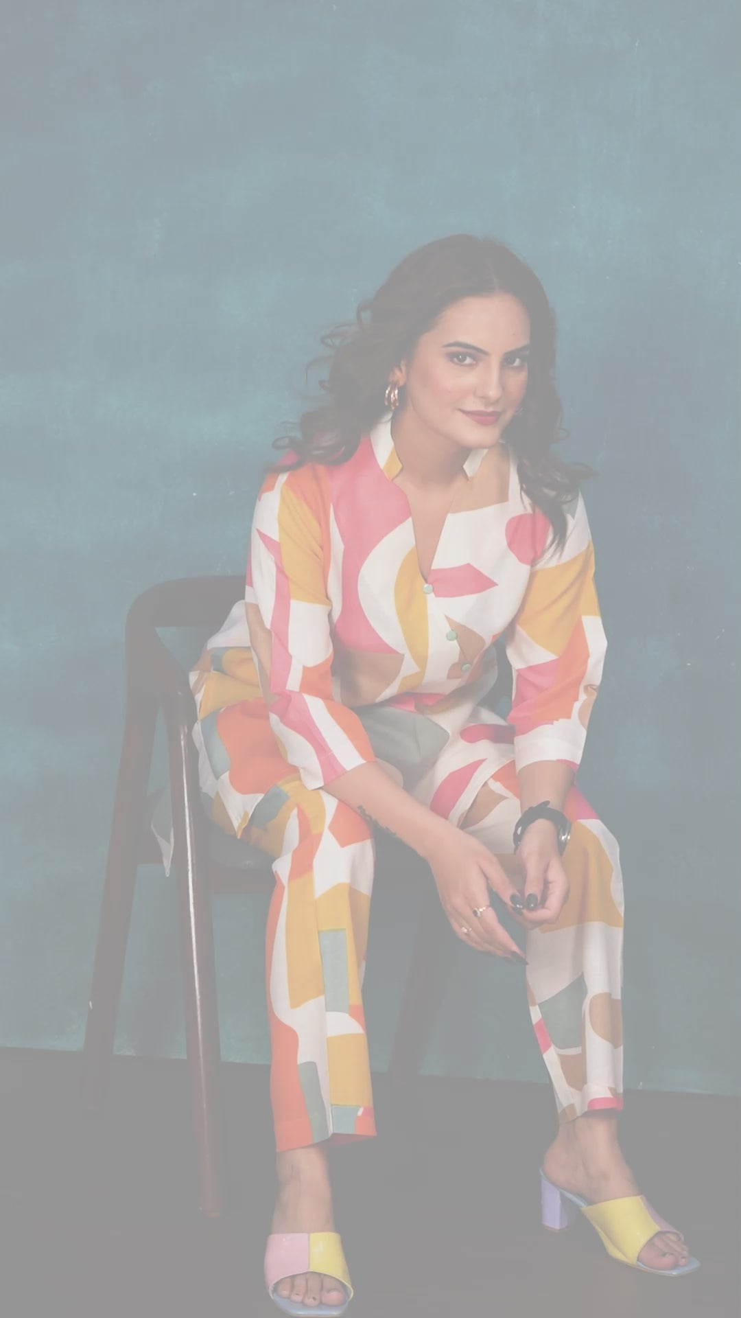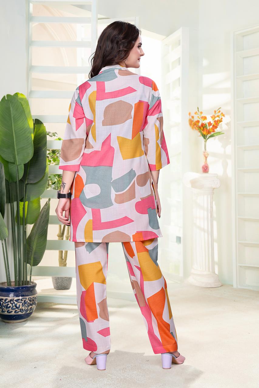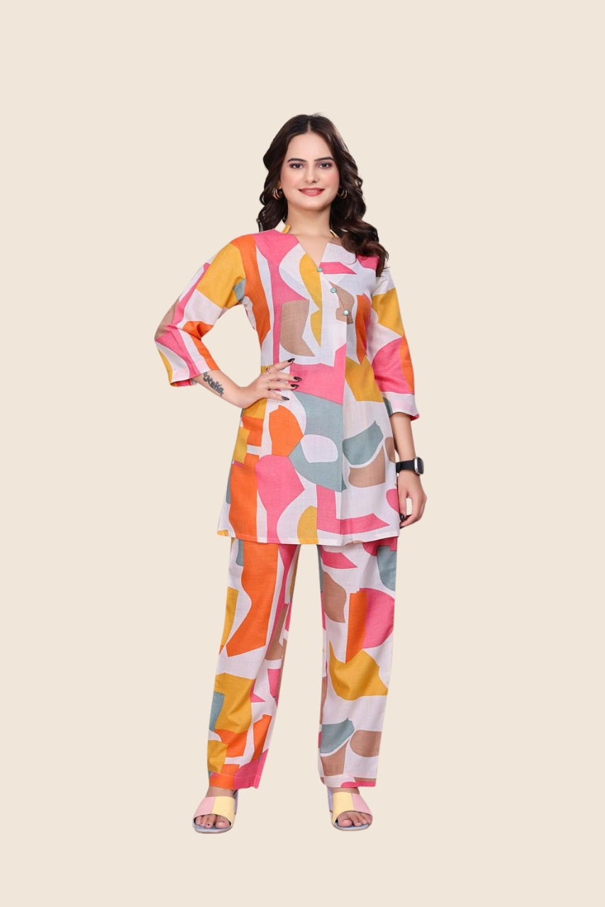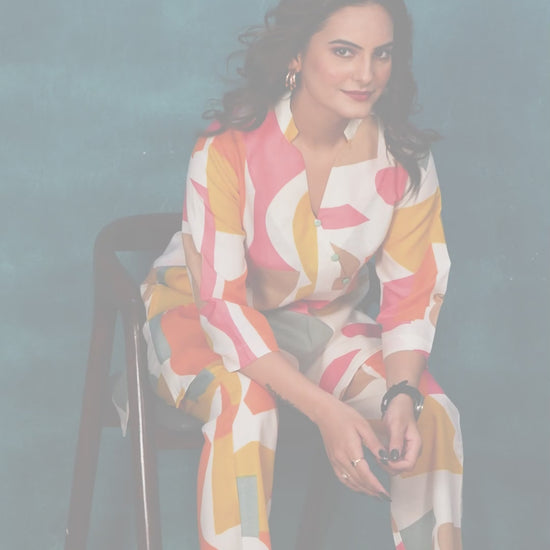 Vibrant multicolor abstract print in shades of orange, pink, mustard, and teal