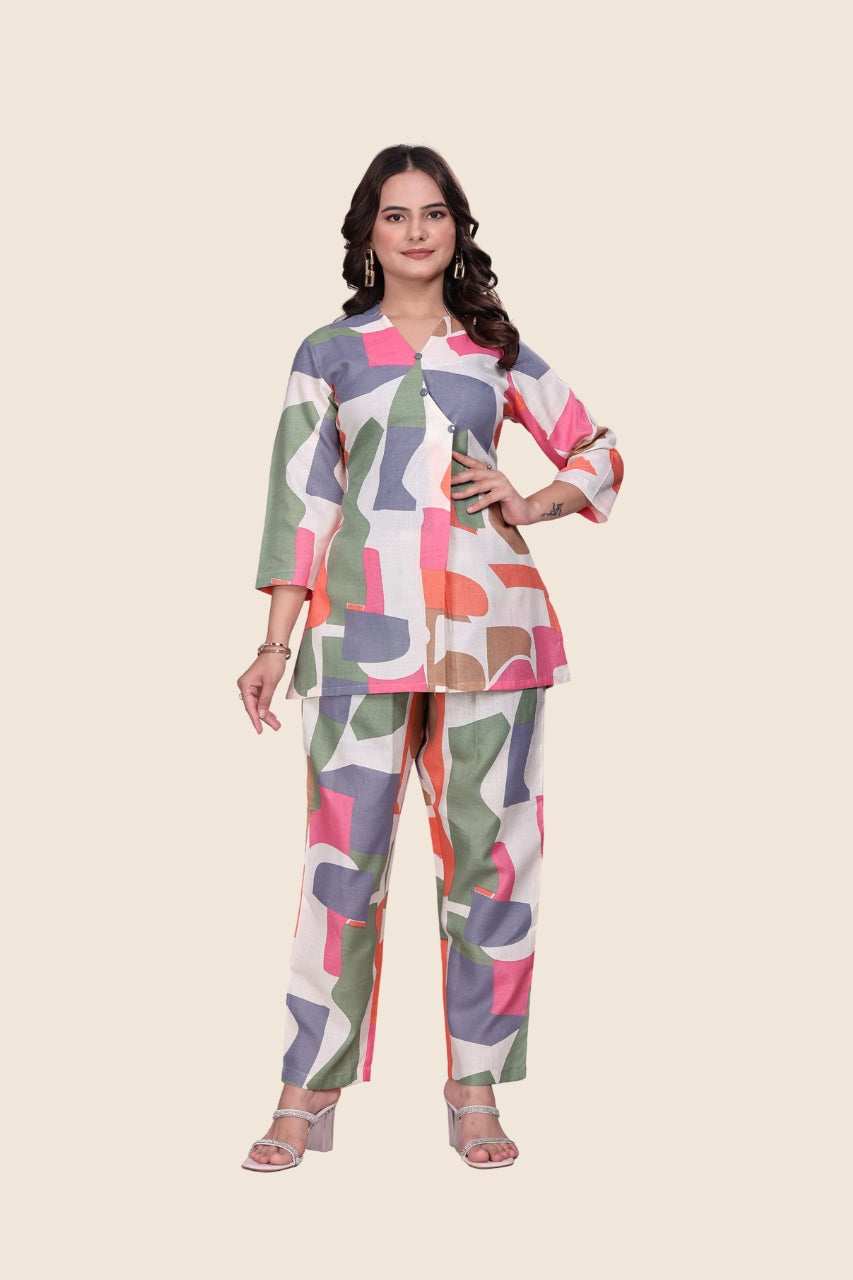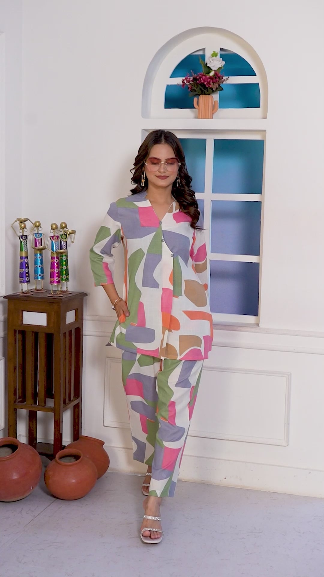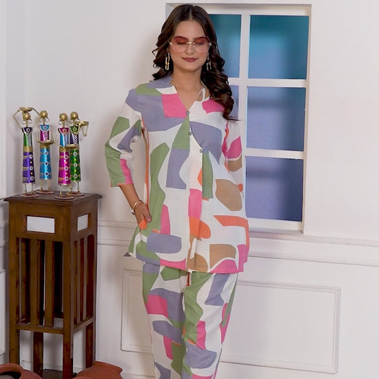 Coordinated top and pants offer a fun, contemporary look perfect for casual outings